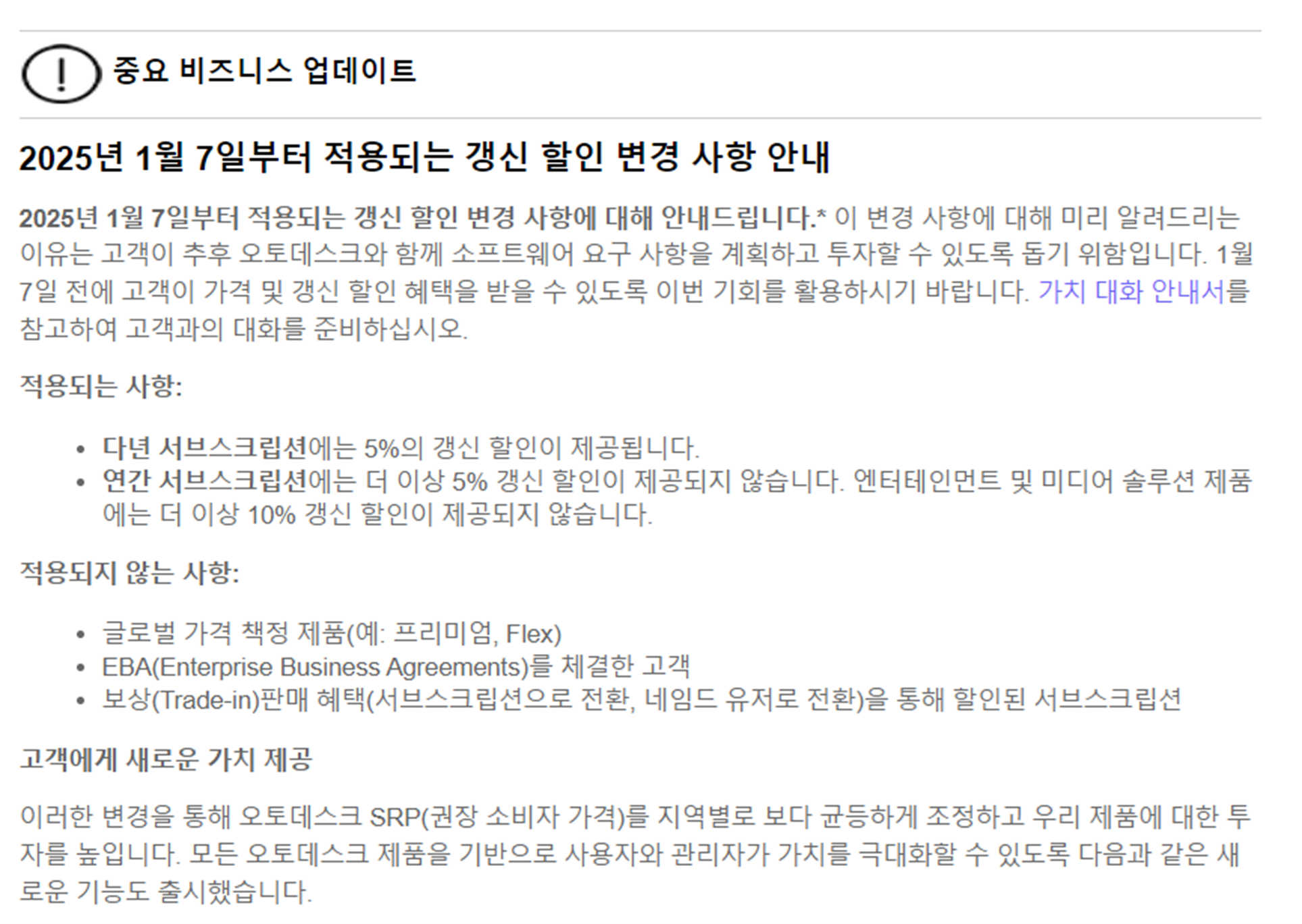 ![]() ¾È³çÇϼ¼¿ä! âÁ¶µ¥ÀÌŸ ÀÔ´Ï´Ù. Autodesk °¡°ÝÀÎ»ó °øÁö 2025³â 1¿ù 7ÀϺÎÅÍ Àû¿ëµÇ´Â °»½Å ÇÒÀÎ º¯°æ »çÇ׿¡ ´ëÇØ ¾È³»µå¸³´Ï´Ù. ÀÌ º¯°æ »çÇ׿¡ ´ëÇØ ¹Ì¸® ¾Ë·Áµå¸®´Â ÀÌÀ¯´Â °í°´ÀÌ ÃßÈÄ ¿ÀÅäµ¥½ºÆ®¿Í ÇÔ²² ¼ÒÇÁÆ®¿þ¾î ¿ä±¸ »çÇ×À» °èȹÇϰí ÅõÀÚÇÒ ¼ö ÀÖµµ·Ï µ½±â À§ÇÔÀÔ´Ï´Ù. 1¿ù 7ÀÏ Àü¿¡ °í°´ÀÌ °¡°Ý ¹× °»½Å ÇÒÀÎ ÇýÅÃÀ» ¹ÞÀ» ¼ö ÀÖµµ·Ï À̹ø ±âȸ¸¦ Ȱ¿ëÇϽñ⠹ٶø´Ï´Ù. Àû¿ëµÇ´Â »çÇ× : 1. ´Ù³â ¼ºê½ºÅ©¸³¼Ç¿¡´Â 5%ÀÇ °»½Å ÇÒÀÎÀÌ Á¦°øµË´Ï´Ù. 2. ¿¬°£ ¼ºê½ºÅ©¸³¼Ç¿¡´Â ´õ ÀÌ»ó 5% °»½Å ÇÒÀÎÀÌ Á¦°øµÇÁö ¾Ê½À´Ï´Ù. ¿£ÅÍÅ×ÀÎ¸ÕÆ® ¹× ¹Ìµð¾î ¼Ö·ç¼Ç Á¦Ç°¿¡´Â ´õ ÀÌ»ó 10% °»½Å ÇÒÀÎÀÌ Á¦°øµÇÁö ¾Ê½À´Ï´Ü. °í°´¿¡¼ »õ·Î¿î °¡Ä¡ Á¦°ø ÀÌ·¯ÇÑ º¯°æÀ» ÅëÇØ ¿ÀÅäµ¥½ºÅ© SRP(±ÇÀå ¼ÒºñÀÚ°¡°Ý)À» Áö¿ªº°·Î º¸´Ù ±ÕµîÇÏ°Ô Á¶Á¤ÇÏ°í ¿ì¸® Á¦Ç°¿¡ ´ëÇÑ ÅõÀÚ¸¦ ³ôÀÔ´Ï´Ù. ¸ðµç ¿ÀÅäµ¥½ºÅ© Á¦Ç°À» ±â¹ÝÀ¸·Î »ç¿ëÀÚ¿Í °ü¸®ÀÚ°¡ °¡Ä¡¸¦ ±Ø´ëÈÇÒ ¼ö ÀÖµµ·Ï ´ÙÀ½°ú °°ÀÌ »õ·Î¿î ±â´Éµµ Ãâ½ÃÇß½À´Ï´Ù. °¨»çÇÕ´Ï´Ù. |